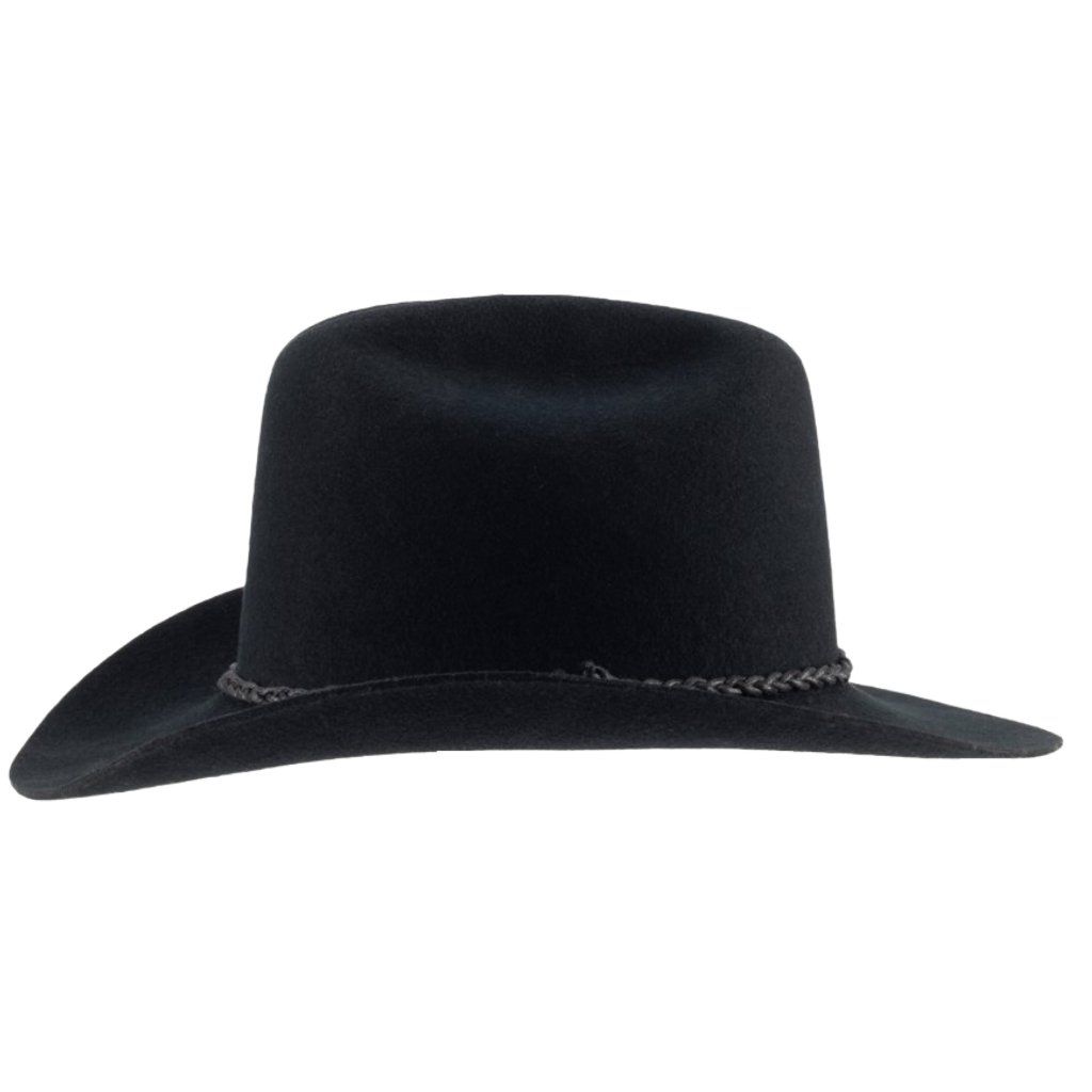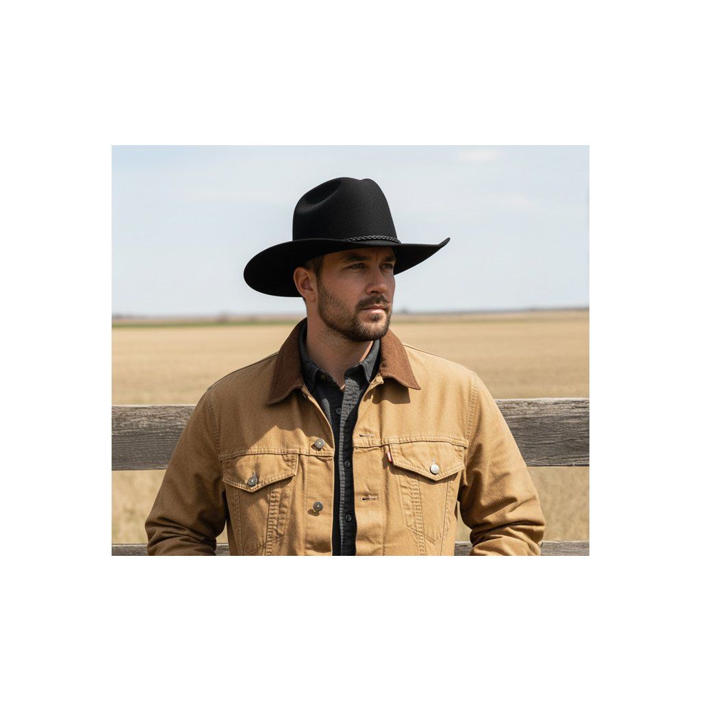 Bandera je výrazný černý westernový klobouk z kvalitní vlněné plsti. Drží tvar, odolá dešti i větru a díky pletenému koženému pásku má charakter, který si nelze splést. Široká zakřivená krempa chrání a vysoká koruna dodává sebevědomý styl.