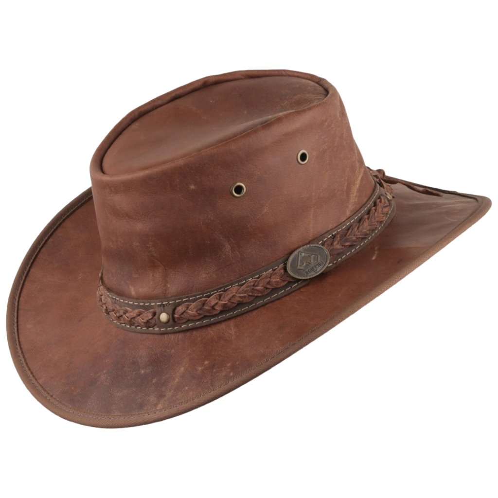 Australský klobouk Sundowner z klokaní kůže je ztělesněním pravé australské tradice a kvality. Vyroben z vysoce kvalitní a odolné klokaní kůže, která prošla impregnační úpravou, tento klobouk je nejen mimořádně odolný, ale také lehký a pohodlný. Díky elastickému vnitřnímu pásku zajišťuje pevné a příjemné nošení, zatímco praktická větrací očka se postarají o potřebné odvětrání v horkých dnech. Ozdoben je pleteným páskem z pravé kůže, který dodává klobouku elegantní a autentický vzhled.