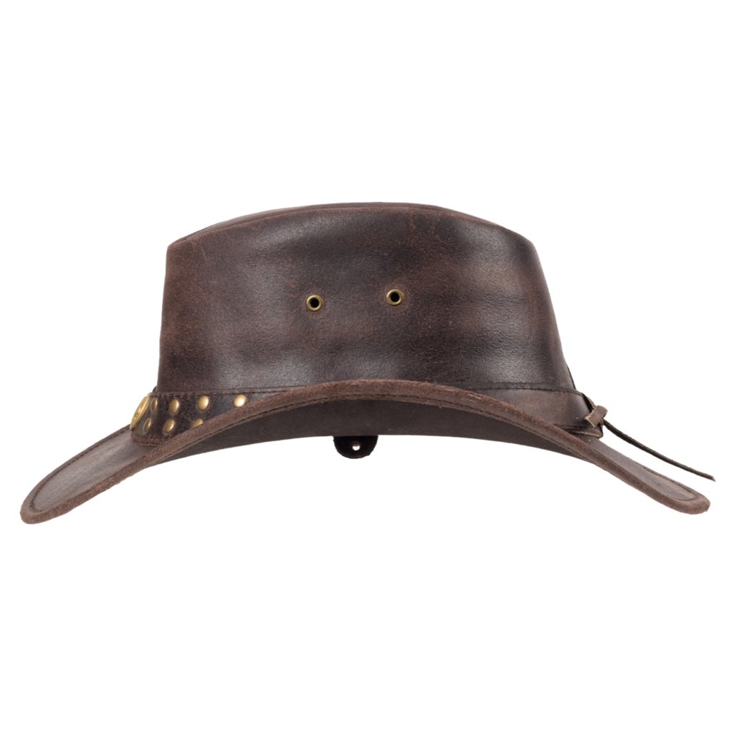 DRIFTWOOD PIONEER je výrazný kožený westernový klobouk s robustní konstrukcí, nýtovanou koženou stuhou a autentickým vintage vzhledem. Ideální pro milovníky outbacku, přírody i stylového městského dobrodružství.